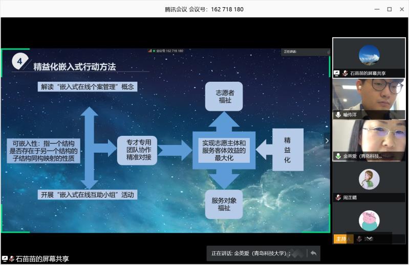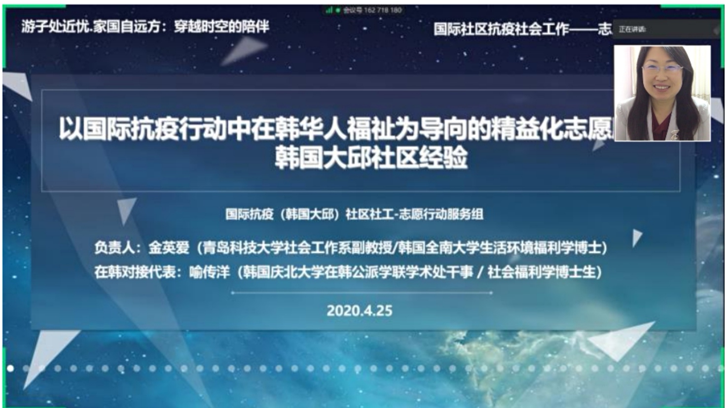 中韩国际社区抗疫行动负责人、伟德国际1946社会工作系金英爱副教授,与在韩对接人代表、韩国庆北大学在韩公派学联学术处干事喻传洋博士生,以《以国际抗疫行动中在韩华人福祉为导向的精益化志愿服务:韩国大邱社区经验》为主题,进行了一场“隔空对接式”联合发言。两位代表的发言以时间为线索,以数据为证据,详细描述了自今年2月底以来,行动组秉承“奉献、友爱、互助、进步“的志愿精神,通过精益化嵌入式的社会工作专业方法,为韩国疫情最严重的大邱广域市中国职工和多文化家庭等2300多名华人群体提供在线公益服务的实务经验和研究成果。