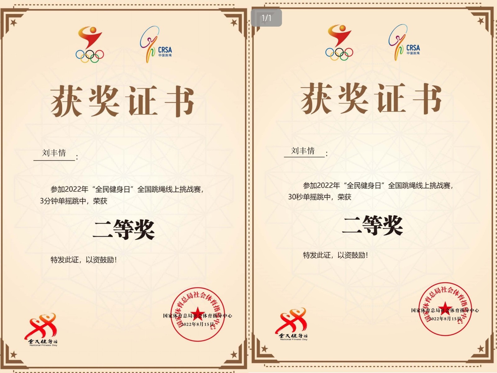 近日,正值2022年“全民健身日”之际,由国家体育总局社会体育指导中心、群体体育司等部门主办的多项体育赛事如期举办。2021级员工刘丰情在全国跳绳线上挑战赛、全民健身线上运动会等比赛中斩获多项大奖。