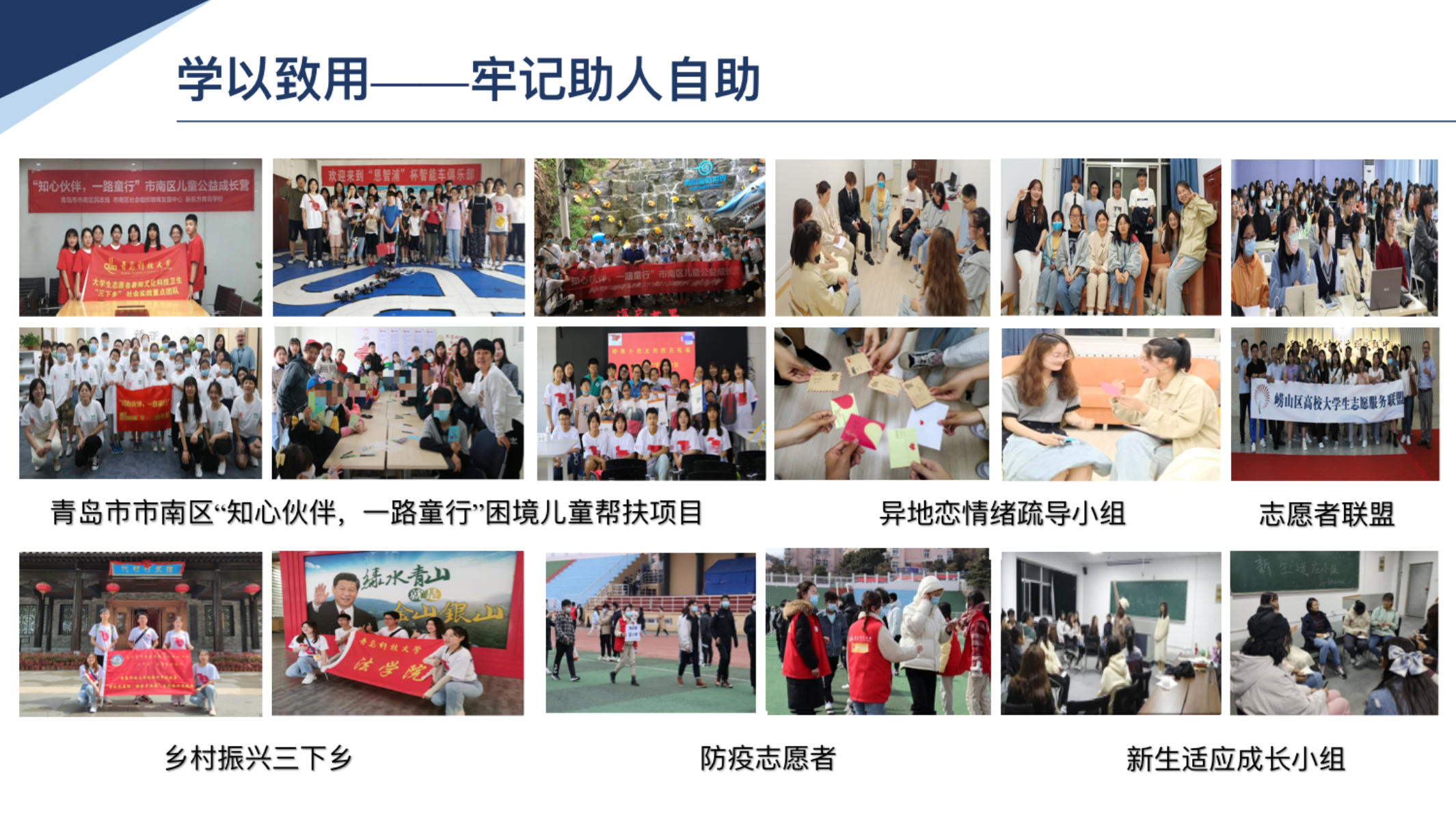 校外的老年公寓实践活动、困境儿童帮扶活动、志愿者服务大赛