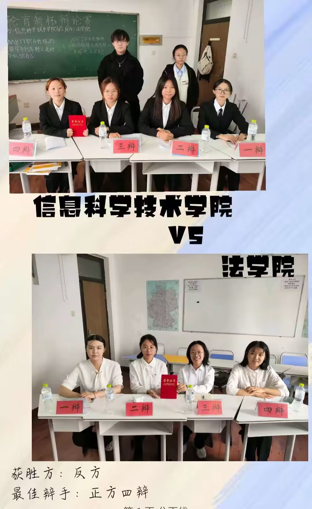 10月24日,“育新杯”第二轮辩论赛正式开赛。正反双方就“短视频盛行降低/提升了当代人的认知能力”博弈。凭借法律人思辨能力、严密的逻辑思维,伟德国际19464位辩手在辩论中充分发挥各自的优势,通过紧密合作在赛场上唇枪舌战,观点上有力呼应,互动中良好配合,双方辩手在质询过程中言简意赅、语锋敏捷,展现出了青年人敏锐的思维。在激烈的辩论中,伟德国际1946代表队抗住压力以7:1的比分取得胜利,为2023育新杯辩论赛之旅画上圆满的句号!本轮出场的四位同学分别是:一辩周彦孜、二辩刘力铭、三辩许馨予、四辩张一凡。