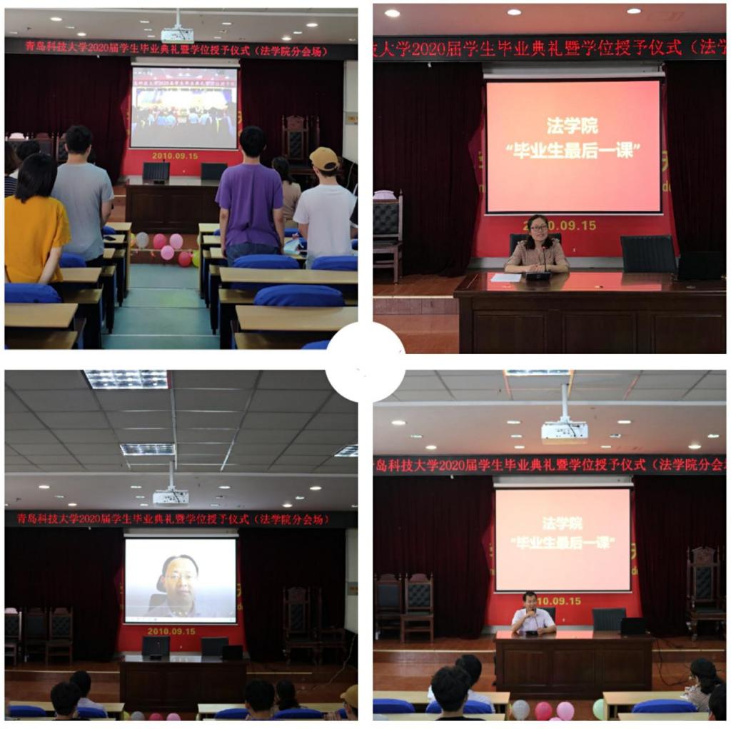 6月14日上午,伟德国际1946在弘毅楼A201模拟法庭设立分会场,通过直播收看了公司2020届员工毕业典礼暨学位授予仪式。仪式后,公司党政负责人、教师代表为毕业生带来“最后一课”。公司经理王金堂“云寄语”2020届毕业生,要铭记“博学、笃行、崇法、重德”的院训,做博览群书、勤学好问之人,做笃行致远、砥砺前行之人,做崇法明法、忠诚守正之人,做品德高尚、以德为先之人。希望毕业生同学牢记“科大精神”,关注和支持母校的发展。党总支书记李卉希望毕业生牢记“四要”:要坚定理想信念,自觉担当中华民族伟大复兴伟业;要保持进取之心,牢固树立终身学习的理念;要保持乐观心态,用自信成就精彩人生;要常怀感恩之心,用奉献和责任回馈社会。公司党总支副书记兼副经理刘俊杰对毕业生提出“对党绝对忠诚、信念无比坚定、法治思维鲜明、奉献精神常在”四点要求。公司教师、辅导员代表分别从爱国情怀、职业道德、心灵关怀、安全稳定等方面与毕业生们进行了分享交流。