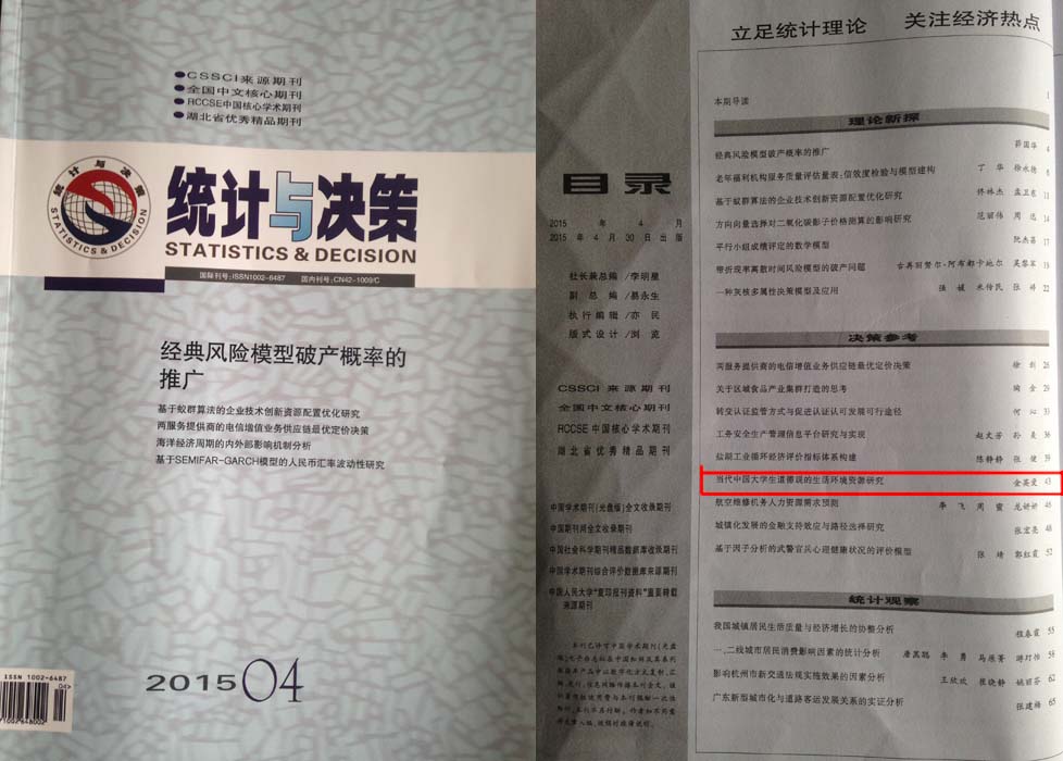 近日,公司社工系金英爱老师在《统计与决策》2015年第4期发表论文《当代中国老员工道德观的生活环境资源研究》,该论文为伟德国际19462014年度教学研究与改革立项重点项目(01051101)“高等公司分层动态式德育体系构建研究”的阶段性成果。