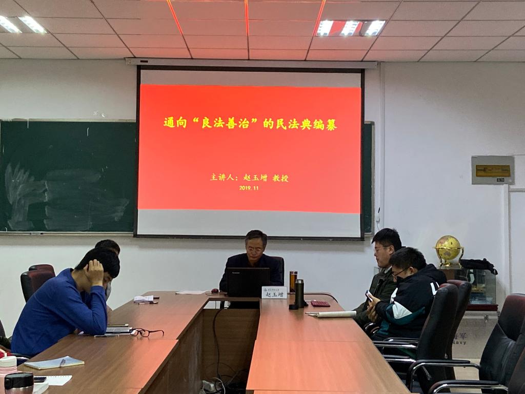 首先,赵玉增教授从法理学的角度探讨了民法典的编纂,强调法律是治国之重器,良法是善治的前提。从社会主义核心价值观的背景、法律与道德关系以及《民法总则》对社会主义核心价值观的规定三个方面论证了将社会主义核心价值观写入民法典是德性的表达。其次,赵玉增教授讲述了绿色原则的植入和构建。分别以物权法编、合同法编、债权法编、人格权编和婚姻家庭为例,提现民法典绿色原则理念的辐射。从而印证了绿色原则是时代发展的新要求,正符合习近平总书记的一句话:“绿水青山就是金山银山”。最后,赵玉增教授还谈论到人格权是否独立成编的问题。引用了台湾民法学家苏永钦教授和大陆民法学家梁慧星教授的观点来论证了立法者如何制造实质的养分。赵玉增教授表示,其他各编均在之前有相关法律作为基础,唯独人格权编没有并且存在程序性瑕疵。