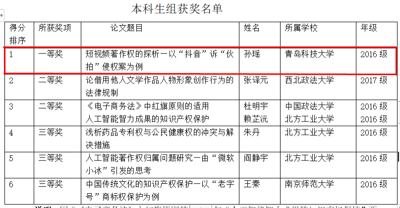 近日,公司法学163班孙瑶同学在“首届京西知识产权论坛”中以《短视频著作权的探析——以“抖音”诉“伙拍”侵权案为例》一文在众多参赛论文中脱颖而出,夺得一等奖。该论文由伟德国际1946曲天明老师指导完成。