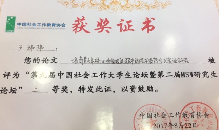 由金英爱副教授指导的2015级史冬梅和迟梦霞的论文《提升社会工作专业老员工核心能力过程中的社会实践介入效果研究》和《农村儿童人生规划能力的环境影响因素分析--基于山东省留守儿童和非留守儿童的比较》获得入围奖,2014级王玮玮的《培育青少年价值观过程中的艺术治疗介入实证研究》获得论坛二等奖。这也是公司连续四届参加中国社会工作老员工论坛以来,继1次一等奖、2次二等奖,2次三等奖之后取得的又一丰硕成果。