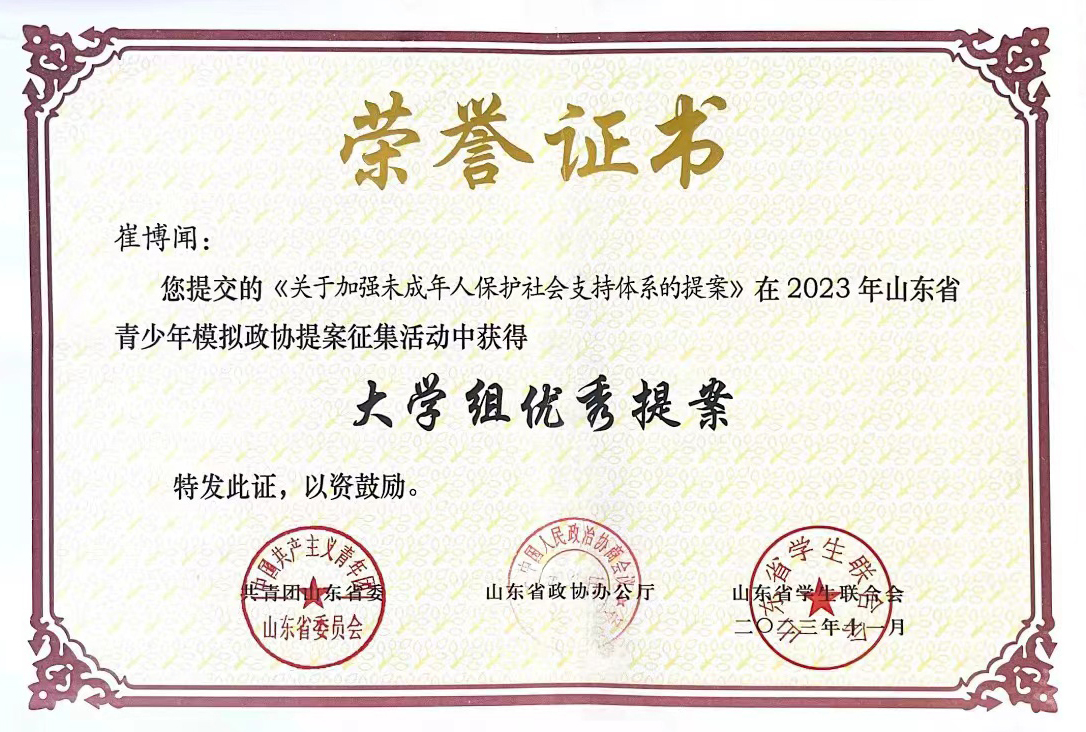 近日,由共青团山东省委、山东省政协办公厅、山东省学联联合举办的2023年山东省青少年模拟政协提案征集活动落下帷幕。伟德国际1946法学223班员工崔博闻的个人提案《关于加强未成年人保护社会支持体系的提案》获评大学组“优秀模拟提案”(全校唯一)。