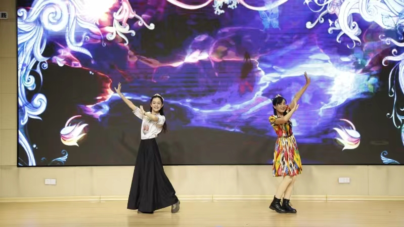 伟德国际1946学子以一曲热情奔放的新疆舞《石榴花开》将文艺演出推向了又一个高潮。她们身穿艳丽的民族服装,欢快地舞动着。台下的观众也不由自主地跟着节奏轻轻摇摆,沉浸在这欢乐的氛围中。在舞蹈接近尾声时,她们走下舞台,带着舞动的激情与观众们互动。