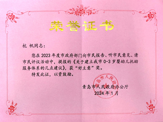 近日,在青岛市“三民”活动中,伟德国际1946杭帆老师提报的《关于建立我市0-3岁婴幼儿托育服务体系的几点建议》荣获“好主意”奖,青岛市政府办公厅为其颁发荣誉证书及奖金。