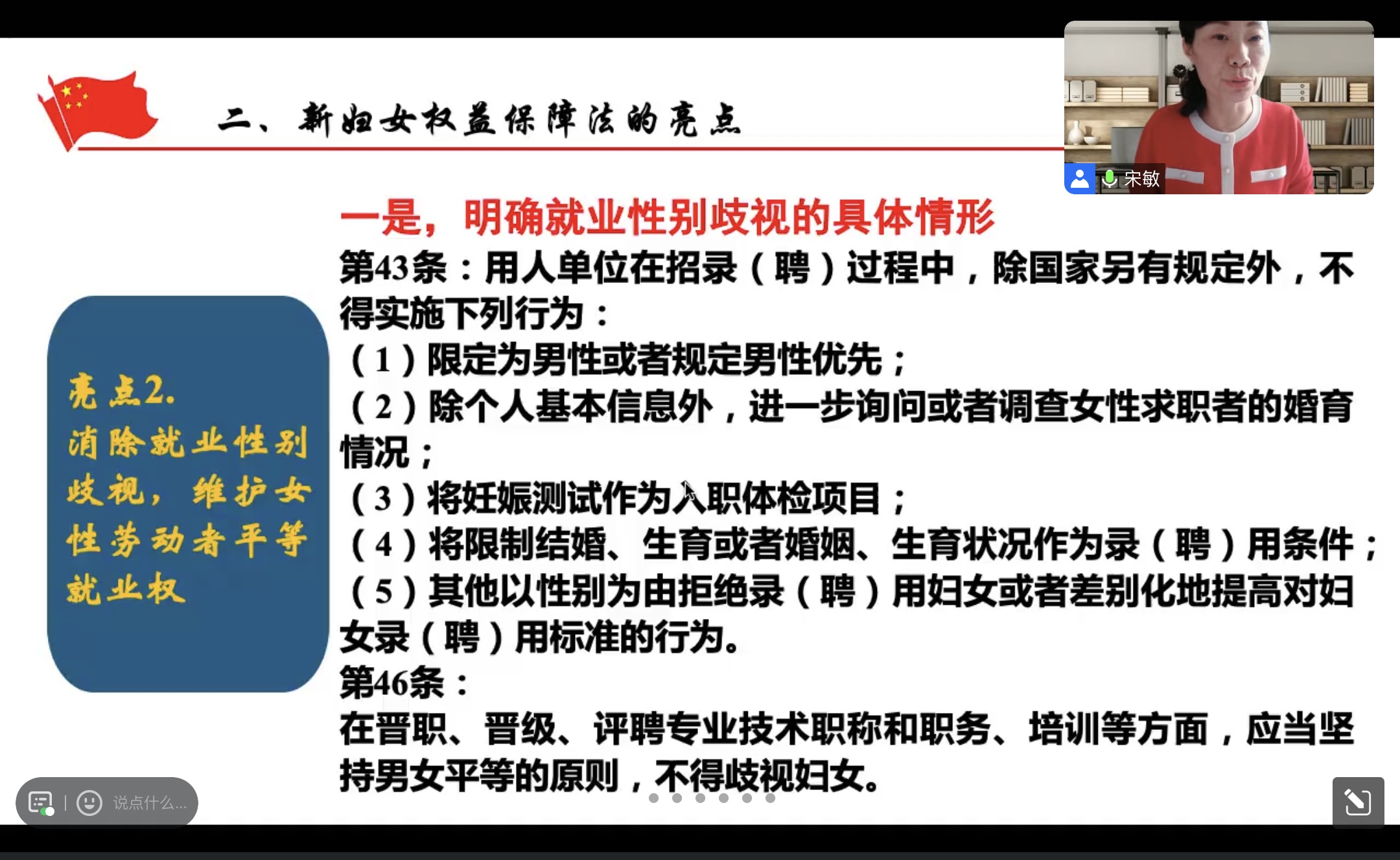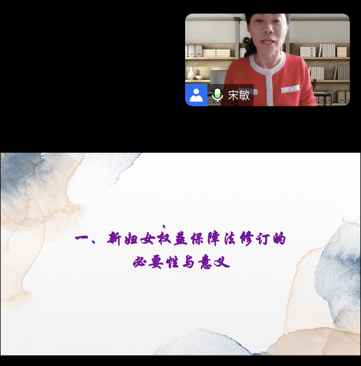宋敏教授以新妇女权益保障法修订的必要性与意义、新妇女权益保障法的亮点等方面为主要内容,对《妇女权益保障法》进行了宣讲。特别针对性别平等、消除就业性别歧视、人格尊严不受侵犯、公益诉讼制度、离婚家务补偿机制等法律知识做了详细解读,同时结合经典案例,帮助广大师生进一步理解法律规定。
