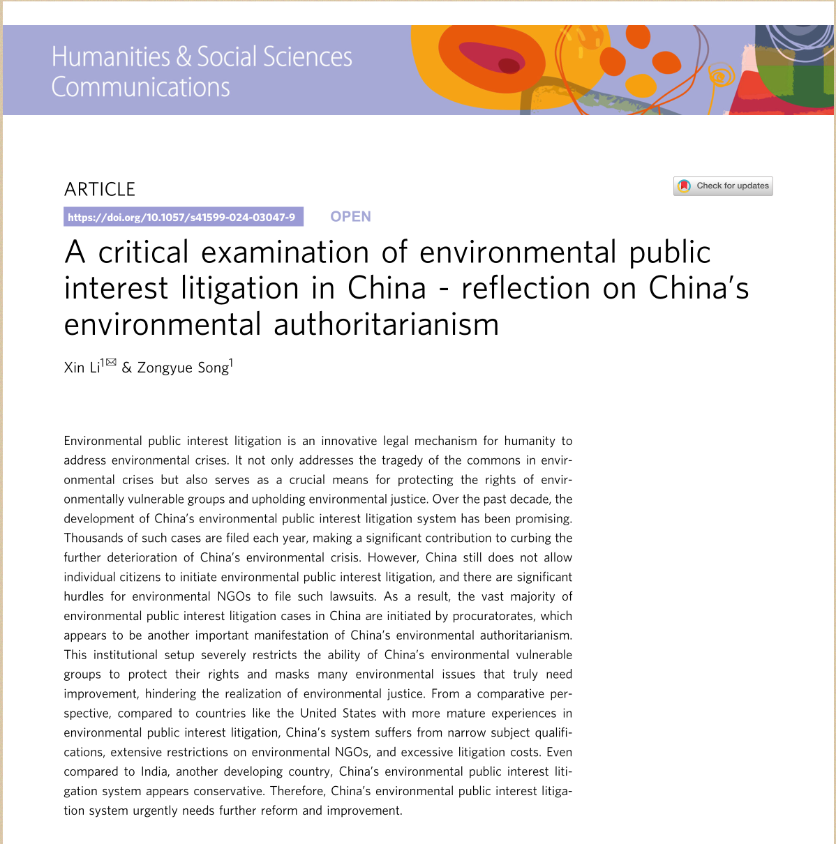 伟德国际1946李鑫教授团队在Humanities & Social Sciences Communications期刊2024年5月发表学术论文“A critical examination of environmental public interest litigation in China - reflection on China’s environmental authoritarianism”。该论文的第一作者及通讯作者为李鑫教授,第二作者为李鑫教授指导的硕士研究生宋宗越。Humanities & Social Sciences Communications(《人文与社会科学通讯》)为Social Sciences Citation Index(SSCI)以及Arts& Humanities Citation Index(A&HCI)两个权威数据库源刊,致力于人文科学、社会与行为科学所有领域的高水平研究,具有良好的全球影响力。Humanities & Social Sciences Communications(《人文与社会科学通讯》)位于国际JCR分区一区,中国科公司期刊分区社会学大类二区。
