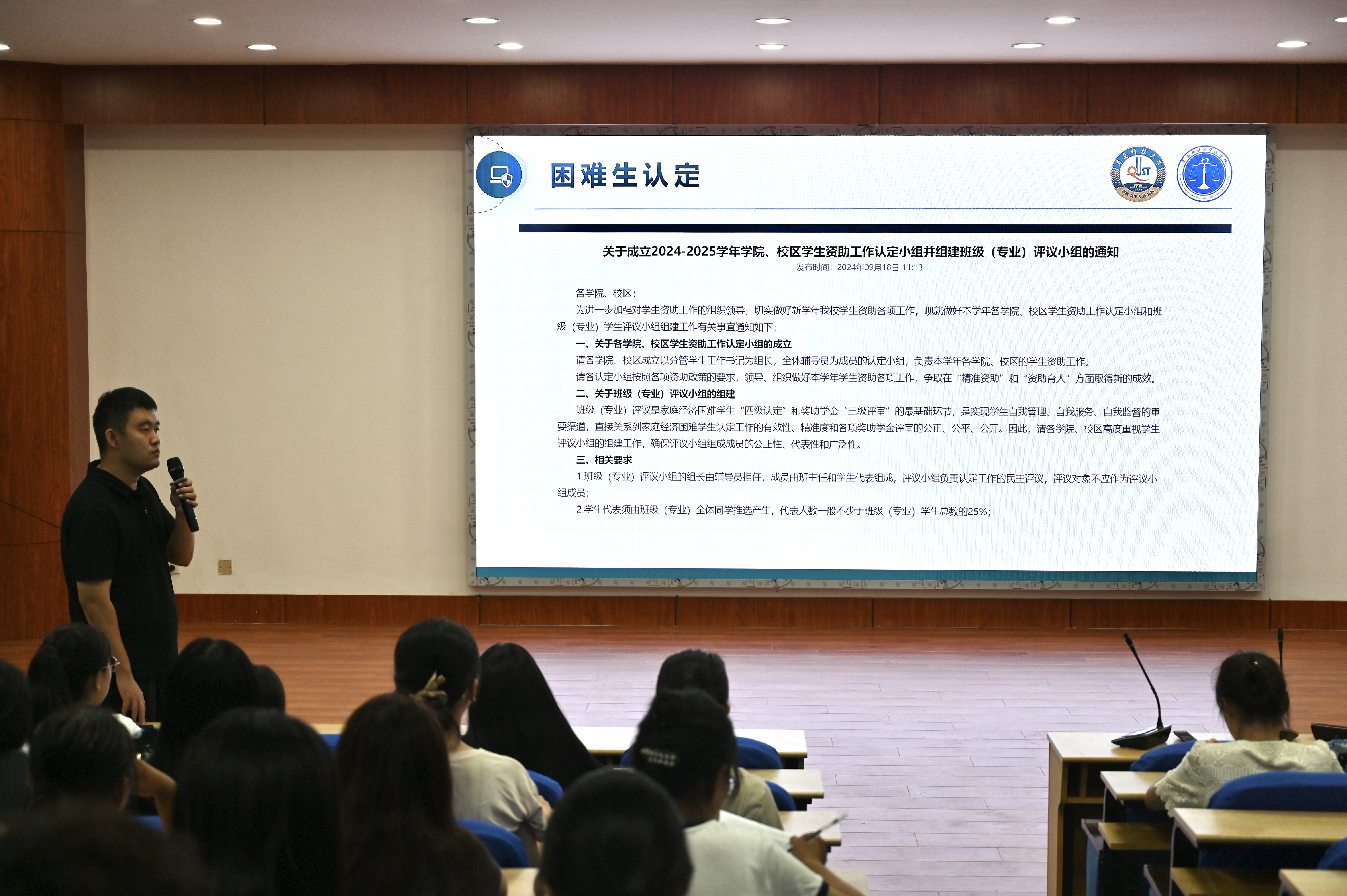 为贯彻落实高校员工资助政策,做好精准资助,推动公司员工资助工作顺利进行,9月23日晚,伟德国际1946在弘毅楼A201模拟法庭开展资助政策宣讲会,公司全体2024级新生参会,会议由辅导员王宇主持。