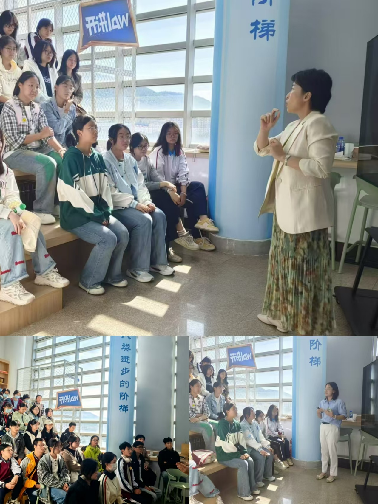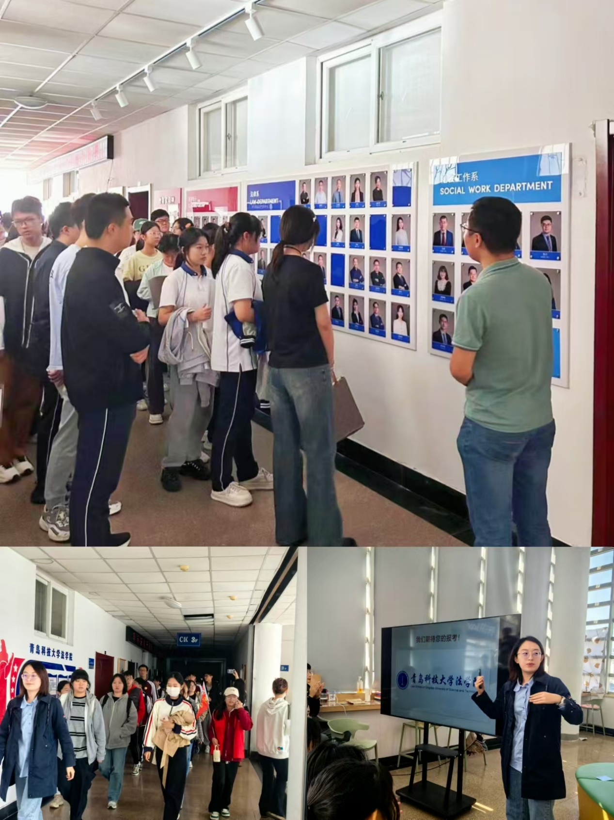 田源、刘琰详细介绍了法学和社工两个专业的基本情况、课程设置,通过生动有趣的互动式交流方式,让同学们对两个专业有了更深层次的认识,也激发了同学们对专业学习的兴趣。同学们参观了公司团队队伍和高质量升学、就业展板,对两个专业未来考研、就业情况有了深入了解。