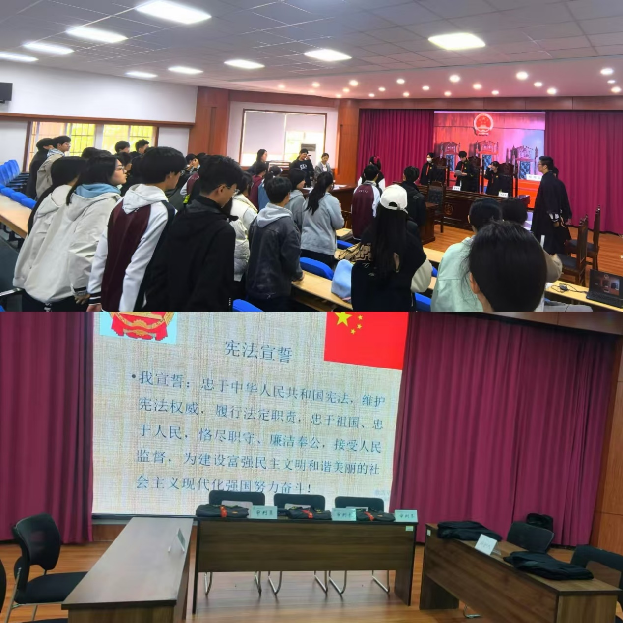 公司精心设计了宪法宣誓和模拟法庭两个体验活动。在宪法宣誓中感受宪法的庄重肃穆,引导员工们坚定不移做宪法的信仰者、实践者、维护者。模拟法庭环节,同学们踊跃报名,通过公司模拟法庭骨干成员的讲解及现场实操,同学们不仅对审判的流程、法院工作人员的职责有了更深切的体悟,还学到了正当防卫相关的理论知识。