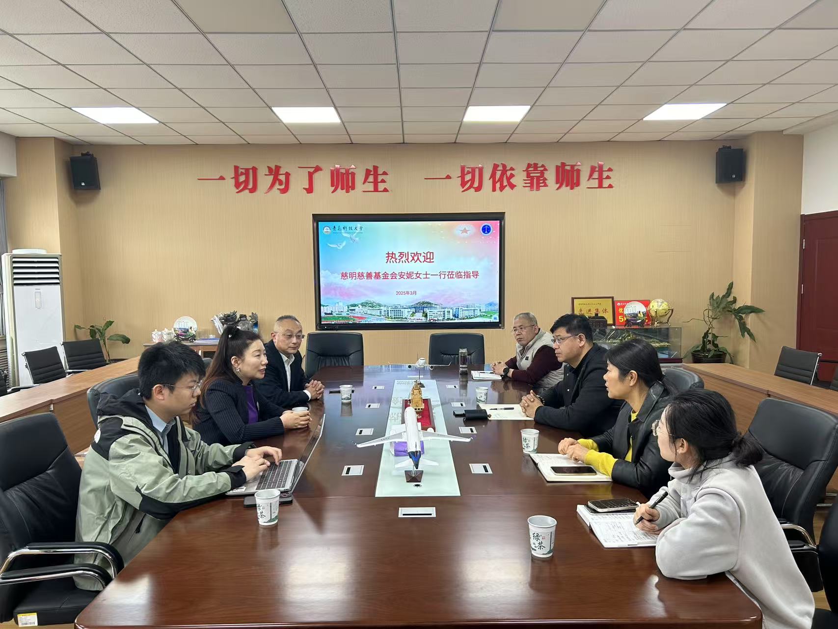 3月3日,青岛市慈明慈善基金会理事长安妮一行来访,公司党委书记曲明、党委副书记兼副经理王祥梅及相关教师代表参加了座谈会。