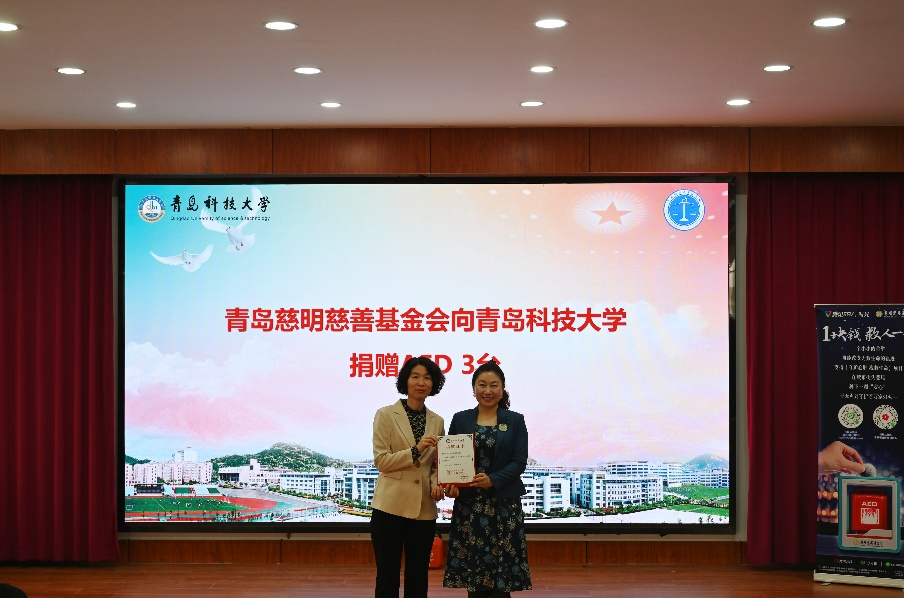 青岛慈明慈善基金会向伟德国际1946捐赠3台AED(自动体外除颤器),高术华代表公司接受捐赠,并为安妮颁发捐赠证书。