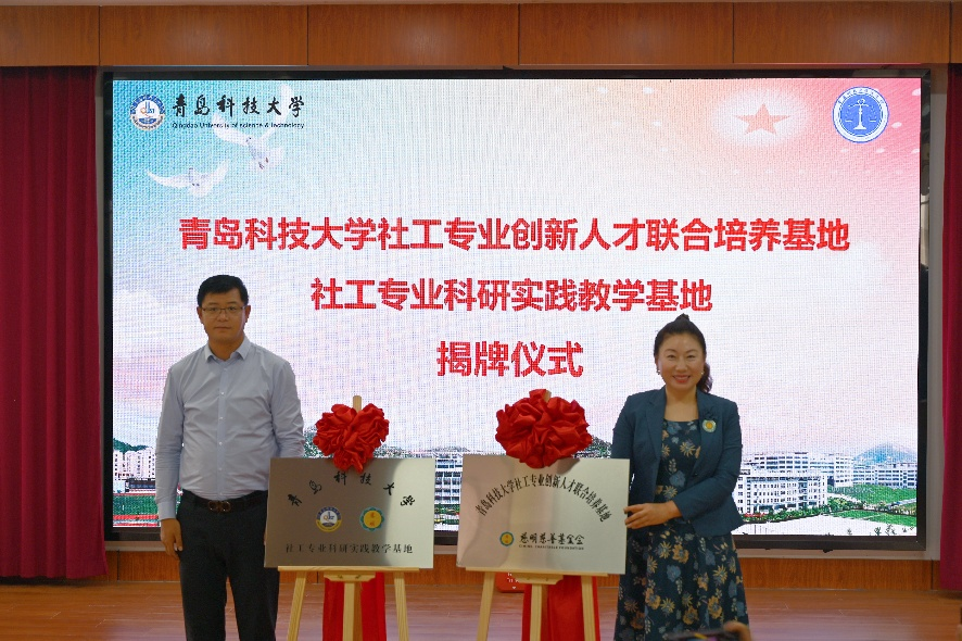 曲明与安妮共同为伟德国际1946社工专业科研实践教学基地与社工专业创新人才联合培养基地揭牌。