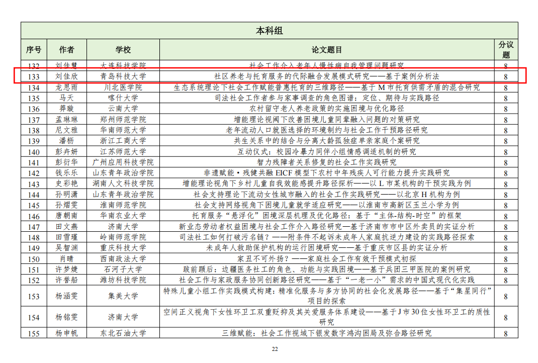 回顾历届山东省社会工作案例大赛,公司成绩格外亮眼。如,在过去的6届山东省高校社会工作案例大赛,公司社会工作学子连续5届获得过一等奖佳绩。不仅如此,在全国性学术论坛方面,公司员工也积极发声、屡获佳绩。如,在历届中国社会工作老员工论坛和MSW研究生论坛中,公司社会工作专业先后有20多名员工获一、二、三等奖等奖项。在各类分论坛上,公司学子也积极分享研究成果,展现出青科大社工学子的风采。