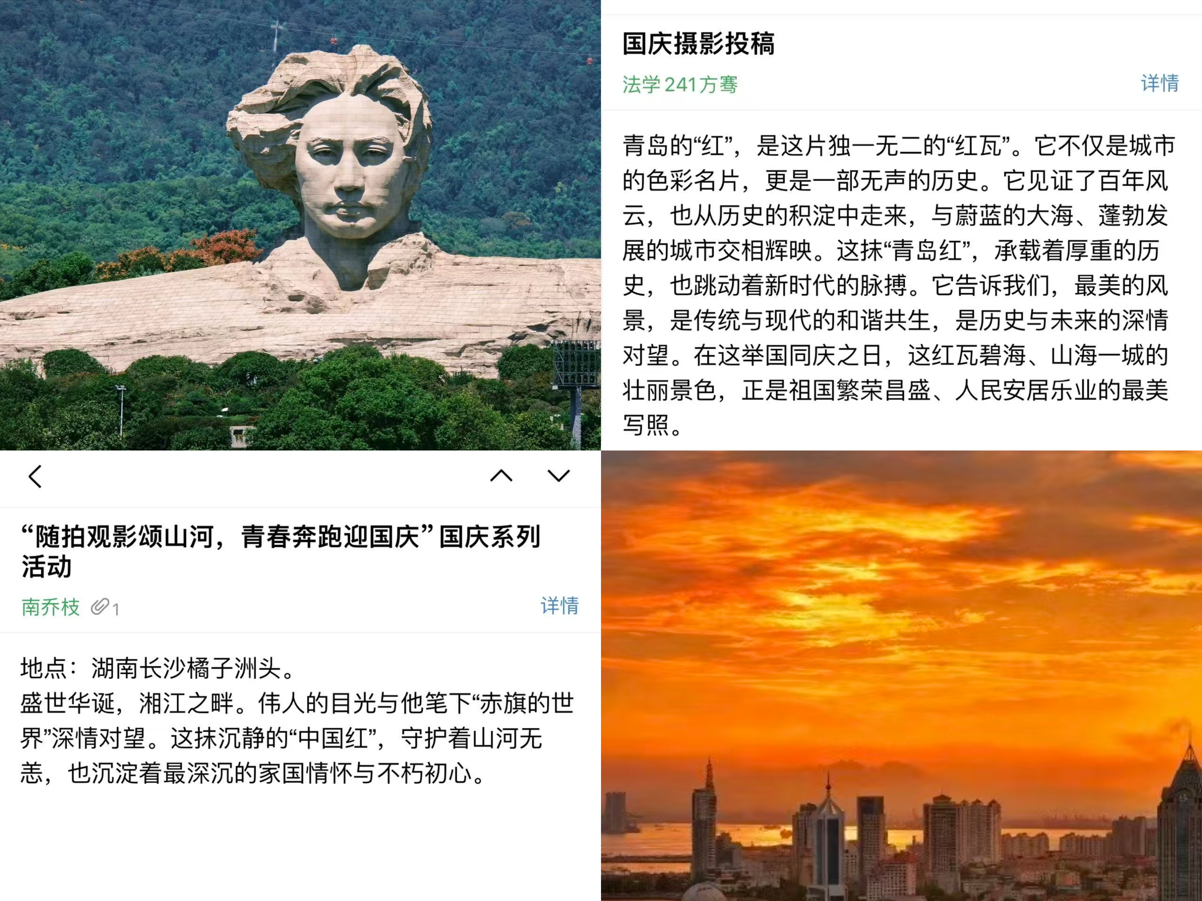 镜头定格中国红,光影传递家国情。中国红,是信仰的底色,更是时代的华章。伟德国际1946开展“盛世华诞,我眼中的中国红”随手拍活动,鼓励学子以镜头为眼、以画面为语,捕捉身边的红色印记。从迎风飘扬的五星红旗到街头巷尾的大红灯笼,从城市地标的红色建筑到平凡生活的温暖瞬间,同学们用照片和文字传递真挚的情感,在光影交织中感悟家国同脉,在创作表达中坚定文化自信。