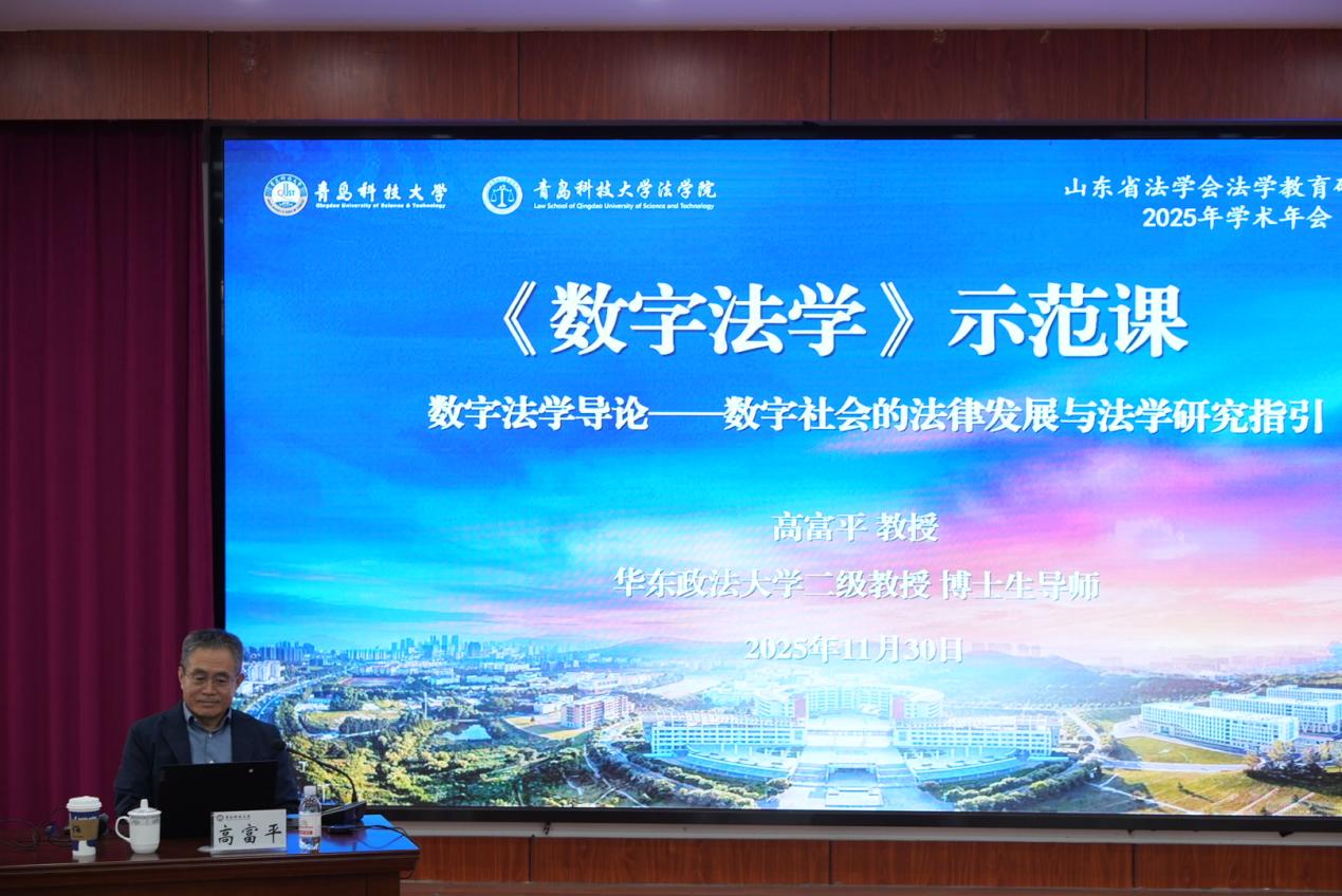11月30日上午,山东省法学会法学教育研究会2025年学术年会之《数字法学》示范课在弘毅楼A201模拟法庭成功举办。示范课由王金堂主持,华东政法大学教授、博士生导师高富平受邀主讲“数字法学导论——数字社会的法律发展与法学研究指引”,深入探讨了数字社会变革下的数字法学,对于数字法学学科体系进行了系统讲解。