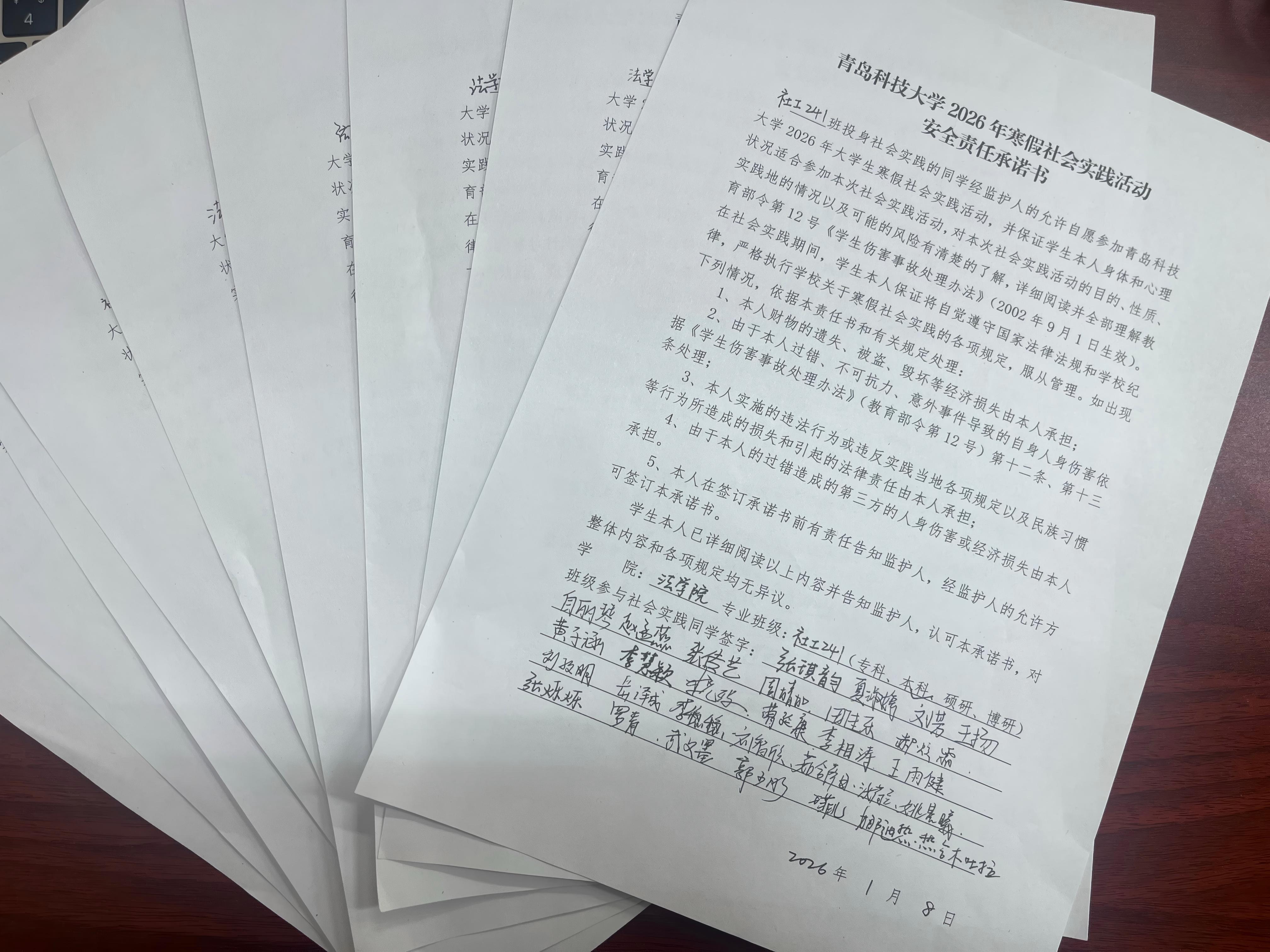 王梦珂还就社会实践的具体组织实施流程、材料报送规范、宣传报道要点等工作逐一说明,并现场耐心解答了同学们在实践选题、团队组建、安全保障等方面的疑问,为大家扫清实践路上的困惑。会后,参与社会实践的同学签订了2026年寒假社会实践活动安全责任承诺书。