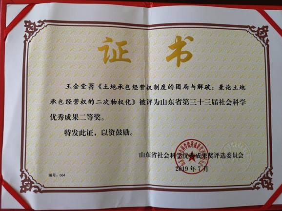 近日,山东省第三十三届社会科学优秀成果奖正式公布,公司王金堂教授在法律出版社出版的《土地承包经营权制度的困局与解破-兼论土地承包经营权的二次物权化》一书获二等奖。