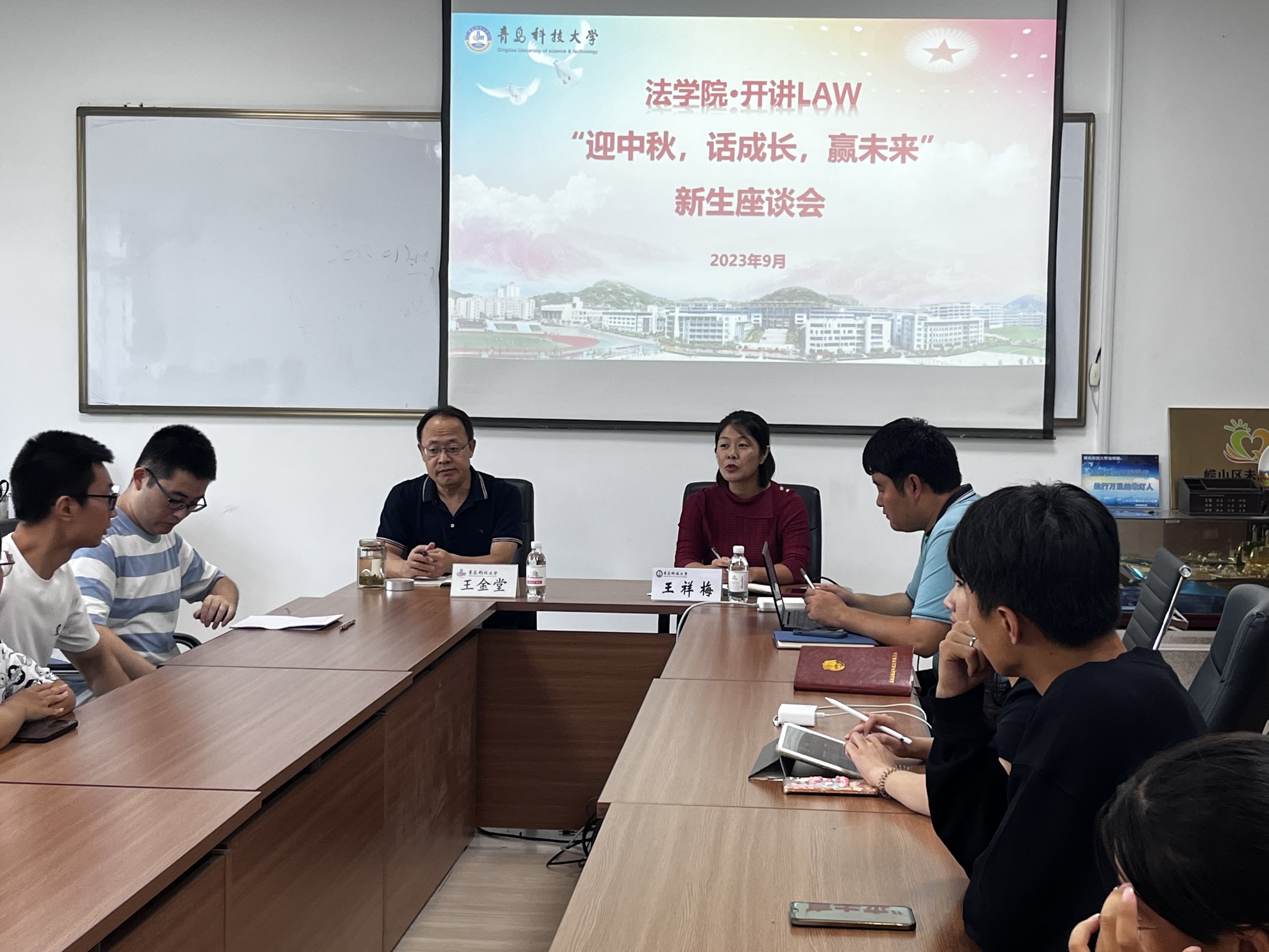 为拓宽师生沟通渠道,倾听员工心声,9月27日下午,伟德国际1946在弘毅楼C307会议室举办“开讲LAW”之“迎中秋,话成长,赢未来”2023级新生座谈会。经理王金堂,党总支副书记兼副经理王祥梅,新生辅导员和40余名新生代表参加座谈。座谈会由王祥梅主持。
